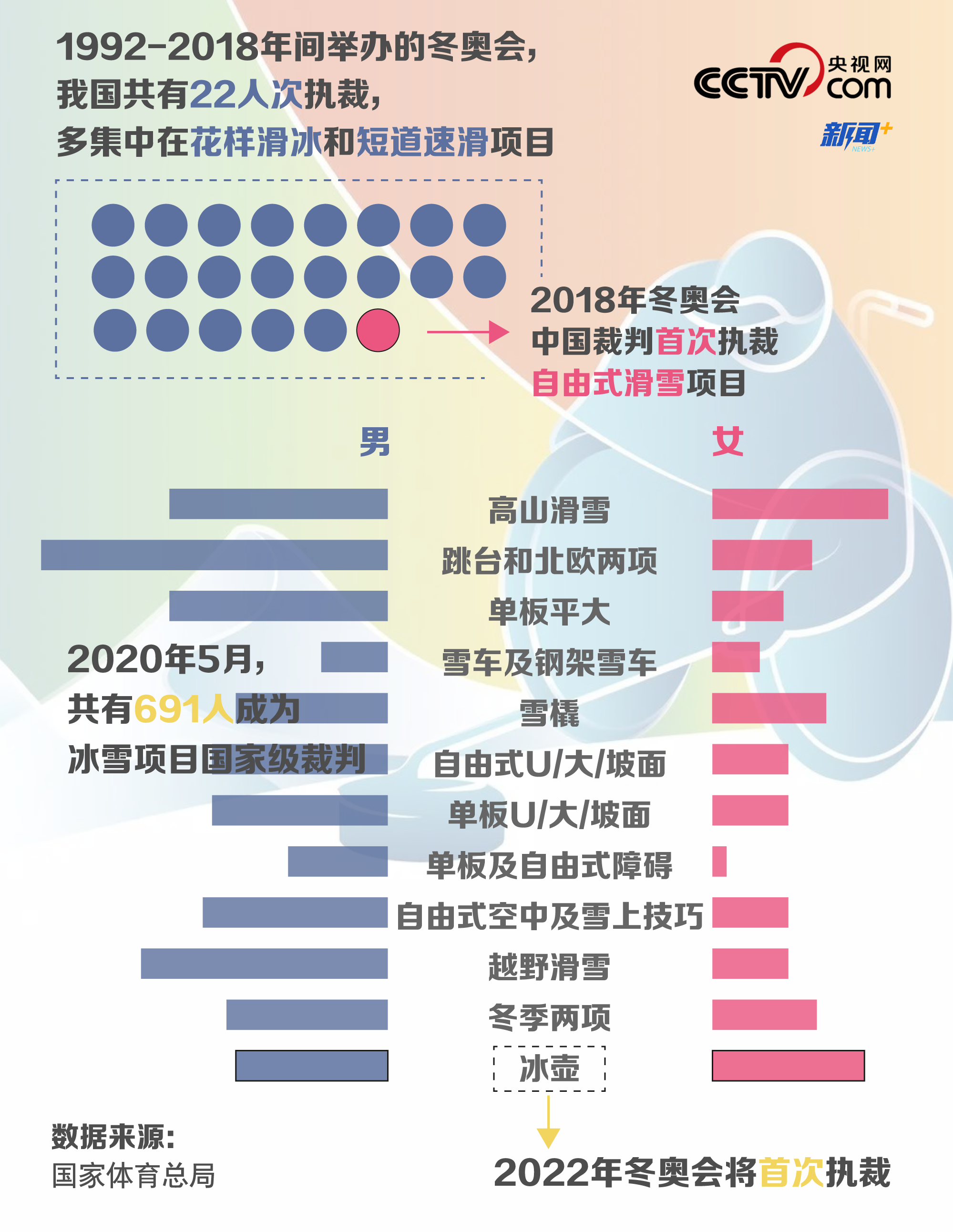 除了選手們在賽場上大放異彩,冬奧會賽場上的裁判席也開始出現(xiàn)“中國身影”。據統(tǒng)計,1992-2018年的冬奧會中,我國共有22人次擔任裁判,2018年的冬奧賽場上出現(xiàn)首位自由式滑雪空中技巧項目的中國裁判。為更好地做好冰雪項目競賽工作,體育總局冬運中心于2020年5月授予691人冰雪項目國家級裁判員稱號,其中多為雪上項目裁判員。值得一提的是,2022年冬奧會將有4名中國冰壺裁判首次執(zhí)裁。