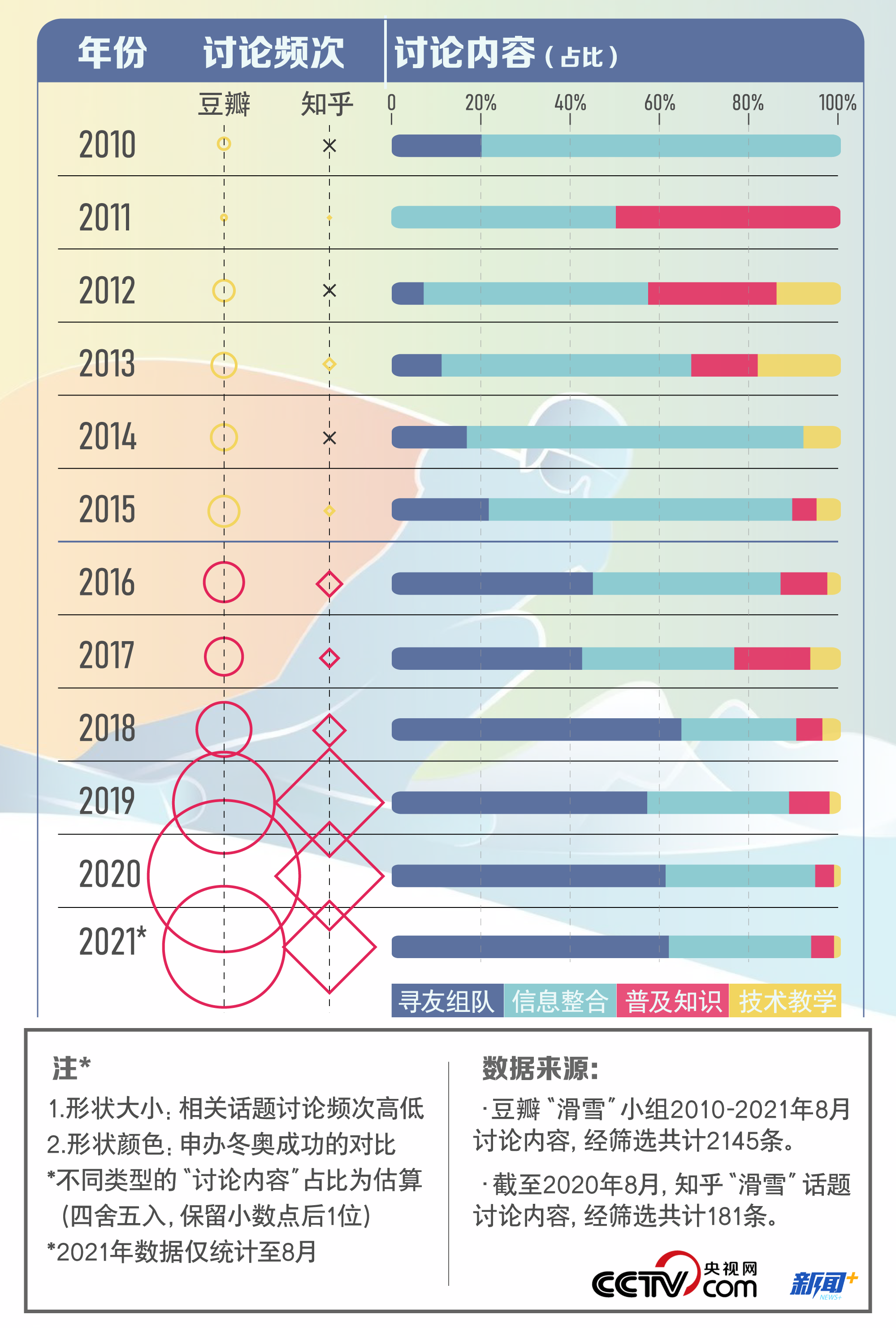 此外,人們對冰雪運動關注和討論的內容也悄然改變。統(tǒng)計發(fā)現(xiàn),隨著中國互聯(lián)網的發(fā)展,2016年開始,“滑雪”在網絡平臺的討論頻次較前五年相比明顯增加,“尋友組隊”成為大部分愛好者的第一需求,而且討論的內容也更為豐富多元,側面反映了滑雪項目正逐漸脫離“小眾”,走向“大眾”。