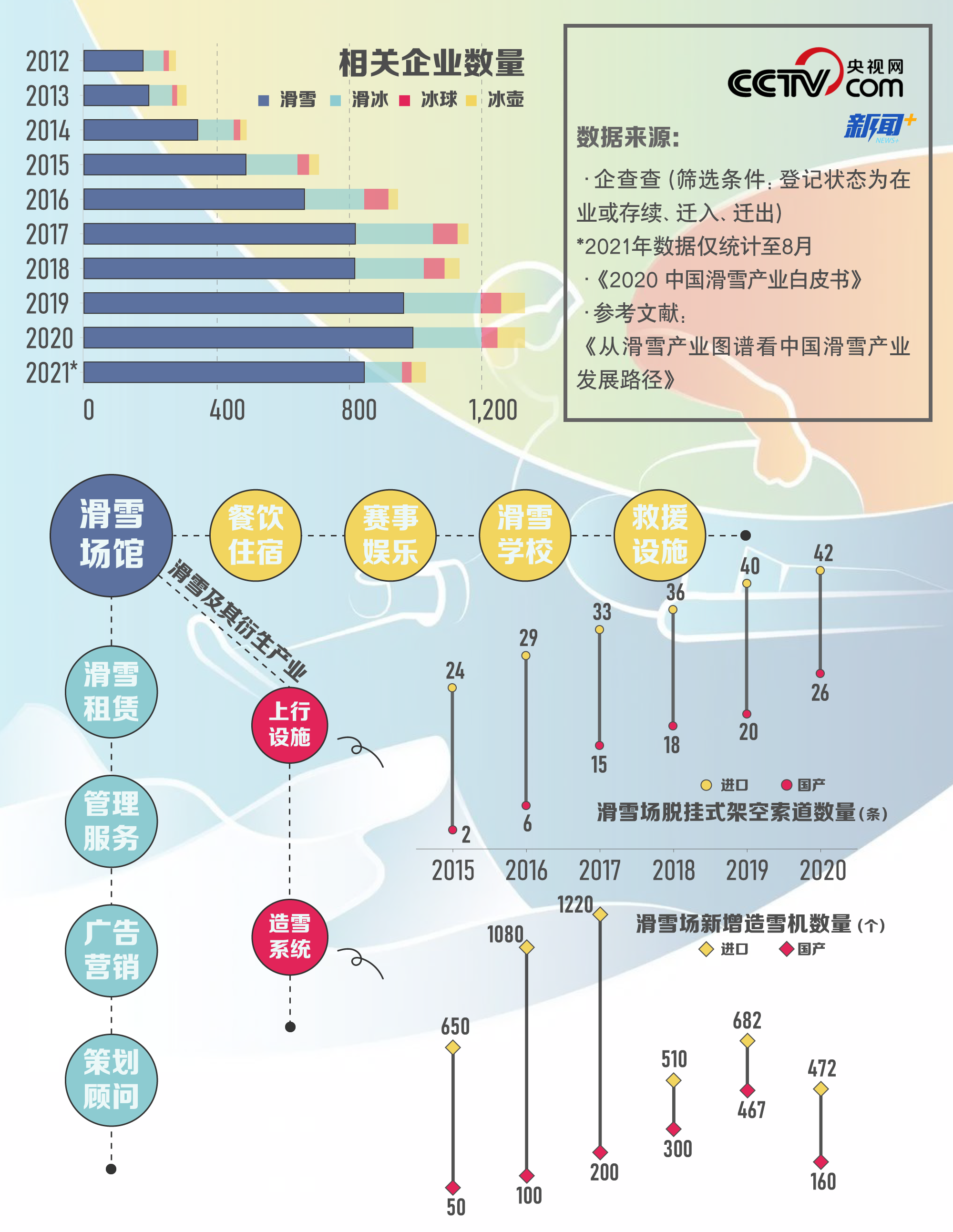 大眾對于冰雪運動的衍生需求給冰雪產業(yè)的發(fā)展奠定了一定基礎。近幾年,中國冰雪產業(yè)蓬勃發(fā)展,相關企業(yè)數量呈明顯上升趨勢,2020年僅“滑雪”類企業(yè)數量就超過2016年四類冰雪企業(yè)數量總和。同時,我國冰雪產業(yè)規(guī)模擴大、覆蓋范圍也變廣,國產品牌逐漸“嶄露頭角”。比如國產脫掛式架空索道的發(fā)展勢頭迅猛,從2015年僅有個位數增長到2020年的26條,此外國產造雪機也正代替進口商品被雪場經營方使用。由此可見,人們對于冰雪的喜愛不僅表現(xiàn)在“直接參與”,還間接推動了衍生產業(yè)的發(fā)展。