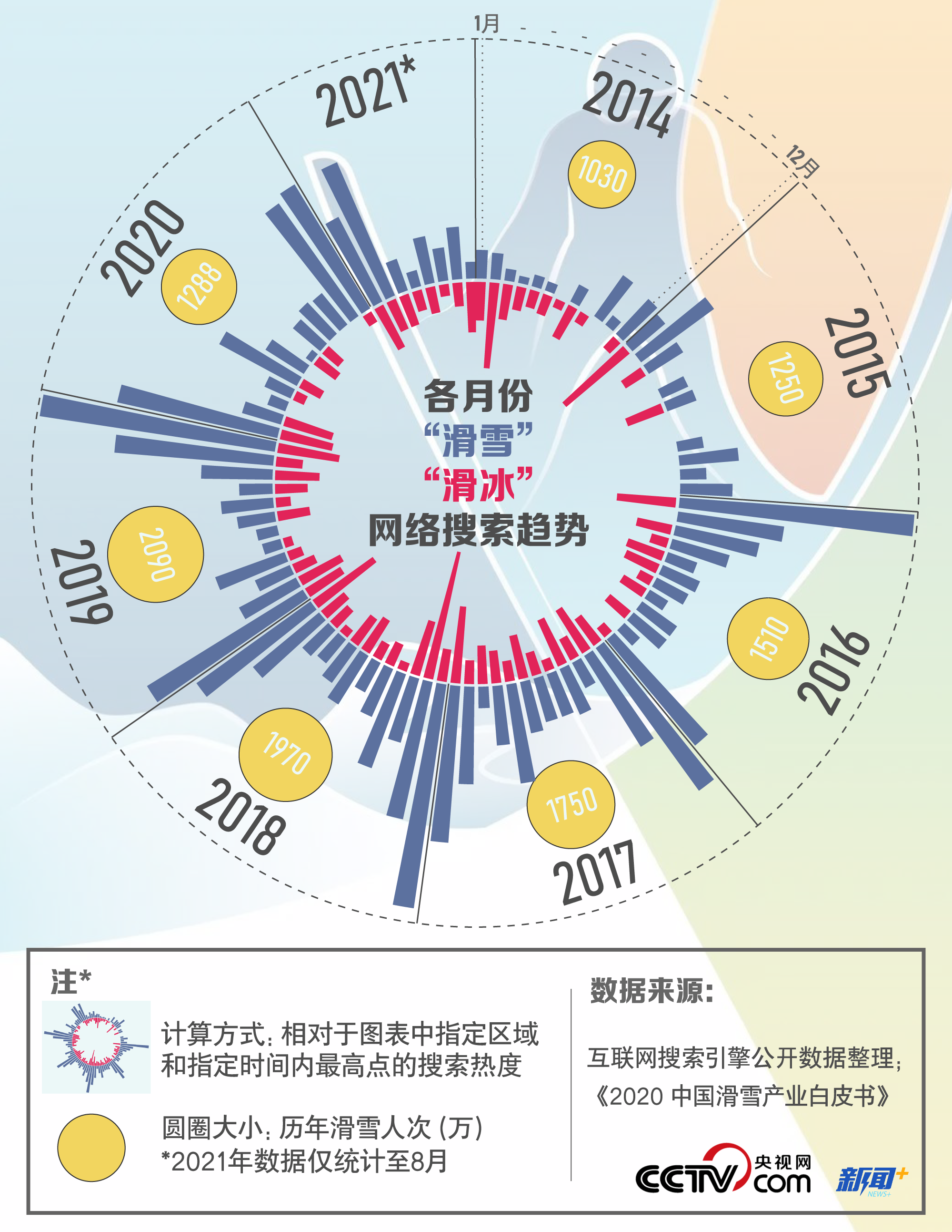 據央視網統(tǒng)計,自2016年起,公眾在互聯(lián)網搜索“滑雪”“滑冰”等冰雪項目的頻次明顯上升,且多集中在11月、12月和次年1月。除2020年受疫情防控的影響外,實際參與滑雪項目的群眾也逐年增多,2019年參與滑雪運動的人次是2014年的二倍。