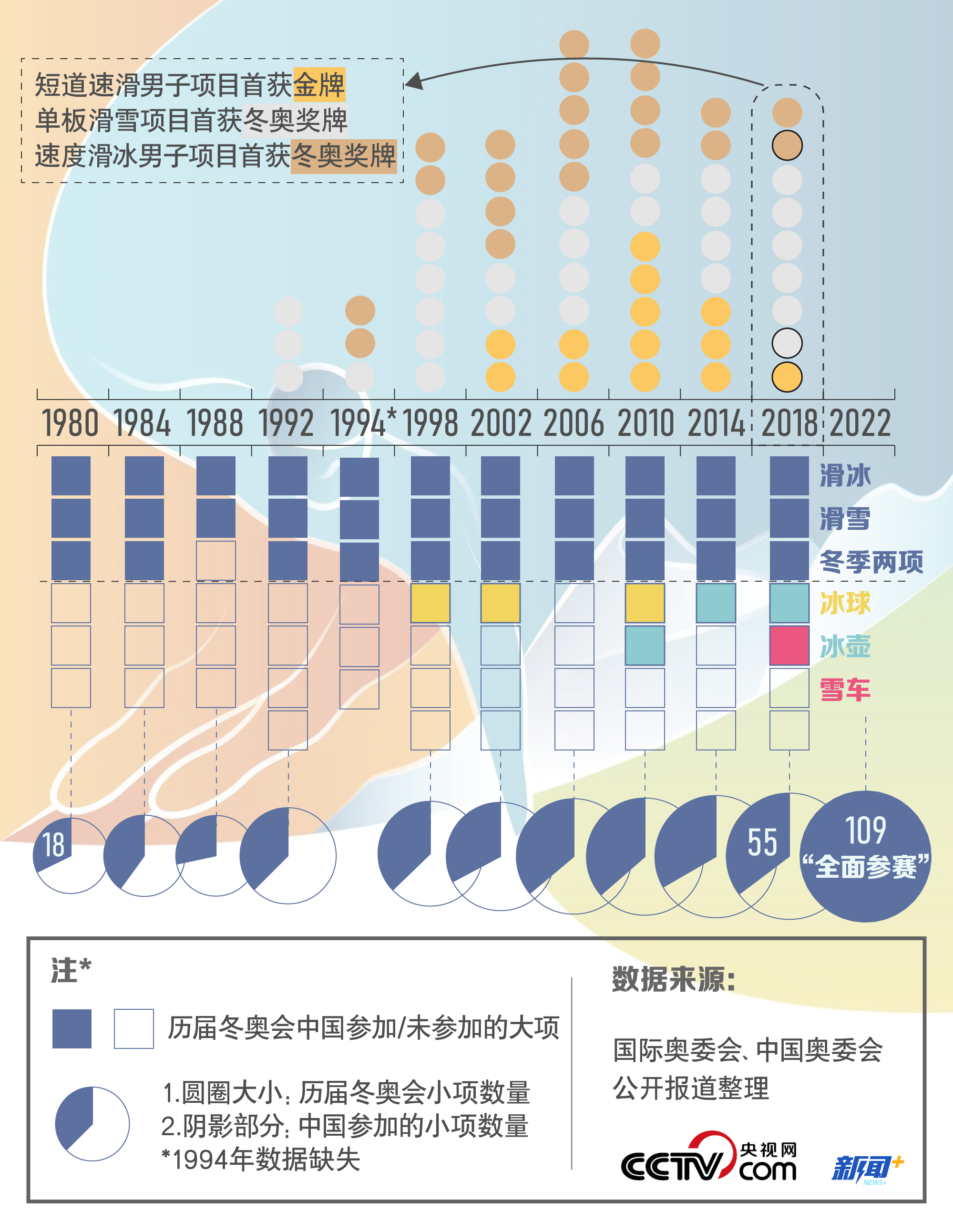 北京獲得冬奧會舉辦權前,中國代表團在歷屆冬奧會上參賽的大項(Sport)僅占所有大項種類的半數左右,除了滑冰、滑雪和冬季兩項等“常規(guī)”項目外,其他項目中零星可見中國運動員的身影。也就是說,許多冬季項目在中國仍然是空白——據統(tǒng)計,在北京冬奧會109個小項(Event)中,大約有三分之一此前并未開展。短短幾年間,中國競技冰雪運動惡補短板,力爭在2022年冬奧會上,從頭至尾都有帶有五星紅旗標志的中國運動員站在賽場上,實現(xiàn)“全面參賽”目標。