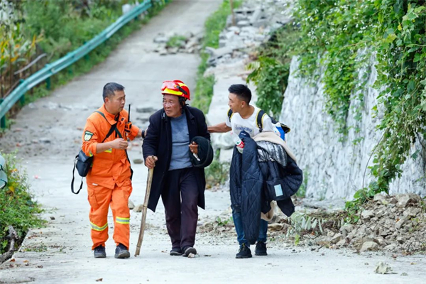 9月6日,救援人員護(hù)送從瀘定縣得妥鎮(zhèn)灣東村疏散出來(lái)的村民。新華社記者 沈伯韓 攝