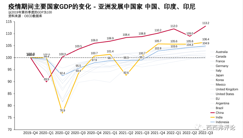 印度作為后起的發(fā)展中國(guó)家,在疫情前,經(jīng)濟(jì)增速已經(jīng)超過(guò)中國(guó)。但疫情這三年,中國(guó)擴(kuò)大了和印度之間的差距。中國(guó)2022年三季度,GDP是2019年四季度的113.2%,印度則只是106.4%。
