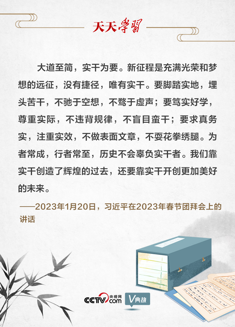 /天天學習/ 1月20日舉行的2023年春節(jié)團拜會上,習近平總書記指出,新征程是充滿光榮和夢想的遠征,沒有捷徑,唯有實干。他引用古語“為者常成,行者常至”,發(fā)出新春號召:歷史不會辜負實干者。我們靠實干創(chuàng)造了輝煌的過去,還要靠實干開創(chuàng)更加美好的未來。