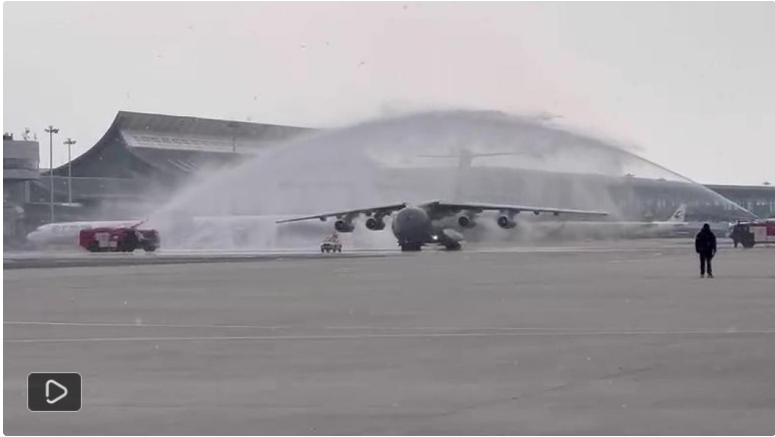 11時30分許,飛機抵達遼寧沈陽,長眠異鄉(xiāng)七十余載的英烈回到祖國。隨后,飛機緩緩?fù)ㄟ^象征著最高禮遇的“水門”。