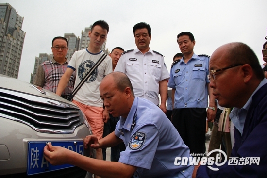 圖注:西安市車管所民警為第200萬輛機(jī)動車掛牌西部網(wǎng)訊(記者 孫鵬) 截止7月3日,西安市全市機(jī)動車保用量突破200萬輛大關(guān)。上午10時左右,交管部門在車管所舉行“第……