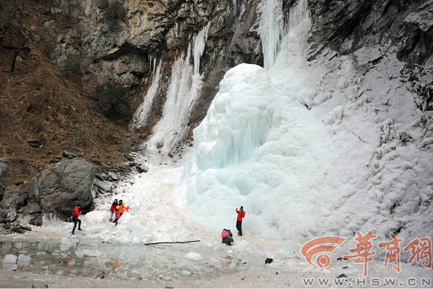 昨日下午2時(shí),游客在戶縣澇峪黑山瀑布前合影留念。不時(shí)有冰塊從瀑布上方掉落,著實(shí)讓人捏了一把汗 記者 趙彬 攝