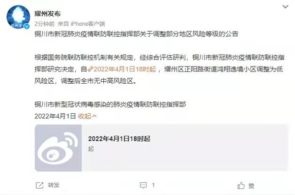 根據國務院聯防聯控機制有關規(guī)定,經綜合評估研判,銅川市新冠肺炎疫情聯防聯控指揮部研究決定,自2022年4月1日18時起 ,耀州區(qū)正陽路街道鴻翔逸境小區(qū)調整為低風險區(qū),調整后全市無中高風險區(qū)。