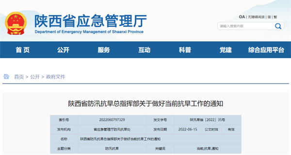 近期我省降水偏少,氣溫持續(xù)偏高,導(dǎo)致陜北北部、陜南東部、渭北出現(xiàn)輕到中度干旱,其中榆林、商洛、渭北局地出現(xiàn)嚴重干旱。后期降水仍將分布不均,旱情發(fā)展演變升級快,影響到工農(nóng)業(yè)生產(chǎn)安全。為做好當前抗旱工作,現(xiàn)就有關(guān)要求通知如下: