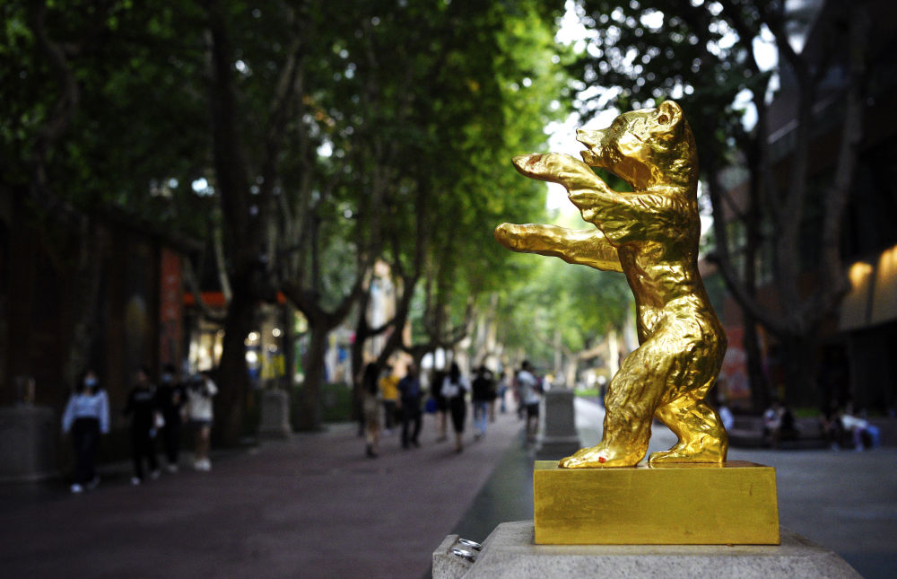 “電影圈子·西影電影產(chǎn)業(yè)集聚區(qū)”的“星光大道”中的“金熊獎(jiǎng)”雕塑。新華社記者 劉瀟 攝