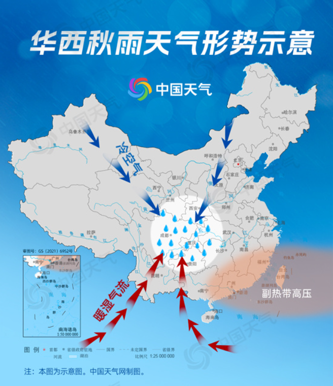 華西秋雨是我國華西地區(qū)秋季(9-11月)特有的天氣現(xiàn)象。秋季,頻繁南下的冷空氣與暖濕空氣在該地區(qū)相遇,使鋒面活動加劇而產(chǎn)生較長時間的陰雨天氣。主要影響區(qū)域為四川、重慶、貴州、寧夏南部、甘肅東部和南部、陜西南部及湖南西部、湖北西部等地。
