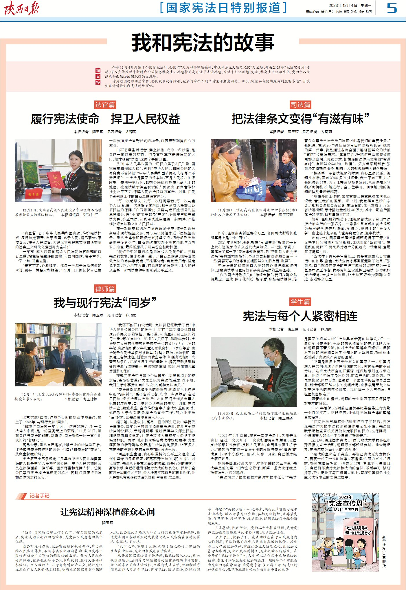 從開(kāi)展國(guó)家憲法日宣傳活動(dòng),讓憲法深入人心,到加強(qiáng)國(guó)旗法、民法典等與憲法相關(guān)的法律法規(guī)的學(xué)習(xí)宣傳,強(qiáng)化國(guó)家認(rèn)同和法治信仰;從舉行憲法宣誓,激勵(lì)和教育國(guó)家工作人員忠于憲法、遵守憲法、維護(hù)憲法,到抓住領(lǐng)導(dǎo)干部這個(gè)“關(guān)鍵少數(shù)”……近年來(lái),陜西認(rèn)真貫徹習(xí)近平法治思想,深入開(kāi)展憲法宣傳,弘揚(yáng)憲法精神,讓尊崇憲法、學(xué)習(xí)憲法、遵守憲法、維護(hù)憲法、運(yùn)用憲法在全社會(huì)蔚然成風(fēng)。
