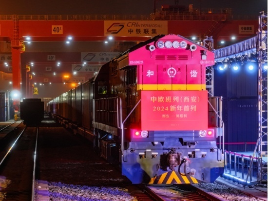 2024年元旦零點(diǎn)整,伴隨著悠揚(yáng)汽笛聲,中歐班列長(zhǎng)安號(hào)2024年首趟班列從西安國(guó)際港站始發(fā)。班列55個(gè)集裝箱滿載紙塑鋁復(fù)合材料和百貨等,經(jīng)阿拉山口口岸出境,將最終抵達(dá)俄羅斯莫斯科,此次“跨國(guó)旅程”約7206公里,全程運(yùn)行13天。