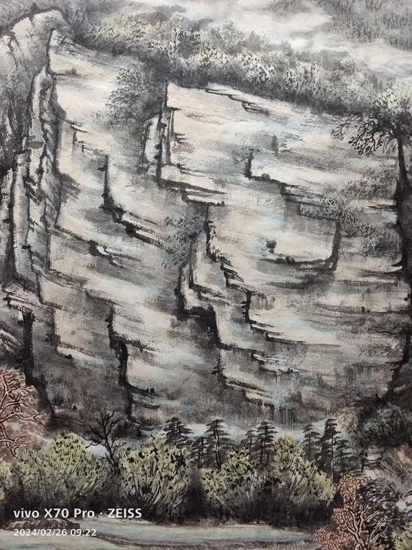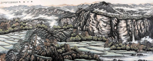 基于這樣的思考,一幅溪山作品的構(gòu)圖在腦海漸漸形成,它將是一幅以綠色為基調(diào)的青山綠水圖畫,是人與自然和諧共生的美麗情愫。全畫由近、中、遠(yuǎn)三部分構(gòu)成,以平視和仰視的角度分別體現(xiàn)。近景畫出幾塊巨大嶙峋的山石,配以年輪久遠(yuǎn)的古松和新植的翠松。背后是暮春的梯田、村落,小河邊有洗衣的婦女和在田間勞作的人們。這些符號(hào)結(jié)合在一起,所要表現(xiàn)的就是時(shí)空久遠(yuǎn)與現(xiàn)實(shí)的延伸,人與自然依然和諧共生共榮,增加現(xiàn)代生活氣息;中景突出巨碑式的丹霞層巖,巖上飛流而下的飛瀑,表現(xiàn)溪山的巍峨與壯觀,這是全畫中必須用心刻畫的細(xì)節(jié)。溪山的厚重、峻峭,都要通過有力的線條表現(xiàn)出來,增強(qiáng)溪山的氣勢(shì)和偉岸,但又要注意不能給人以壓抑感,要以云遮霧掩顯現(xiàn)它的神奇和神秘;遠(yuǎn)景是大山背后的遠(yuǎn)山層巒,分三層漸次疊加。最上一層是春暉映照的暖色遠(yuǎn)山,對(duì)整個(gè)的冷色基調(diào)形成對(duì)比和映襯,使畫面不至于過于沉郁。總之,我要表現(xiàn)的是春色之中磅礴而壯麗的溪山。