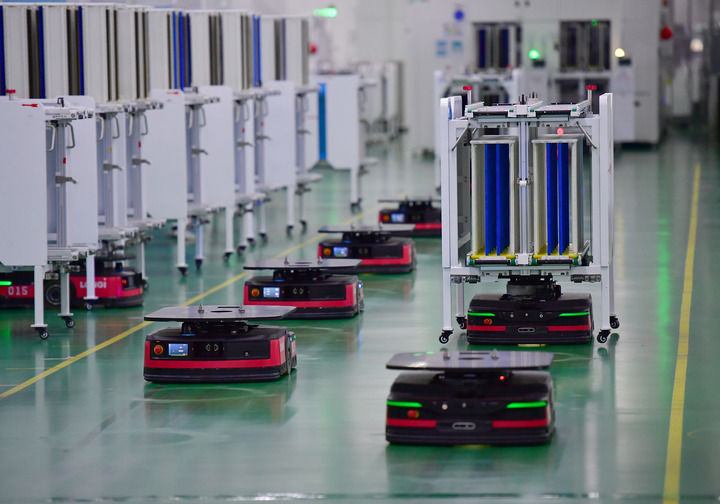 智能搬運(yùn)機(jī)器人在隆基單晶硅太陽能電池工廠內(nèi)工作(2024年3月6日攝)。新華社記者 邵瑞 攝