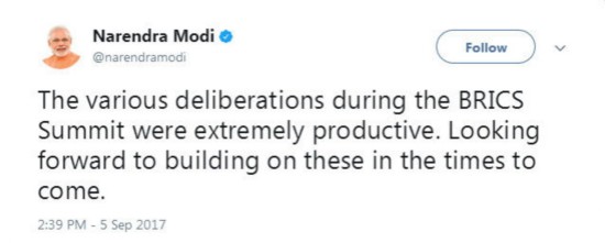 廈門(mén)會(huì)晤期間,印度總理莫迪關(guān)于“金磚”發(fā)了至少15條推文。會(huì)晤一結(jié)束,莫迪連發(fā)6條推文,介紹參會(huì)成果,其中3條是這么說(shuō)的: