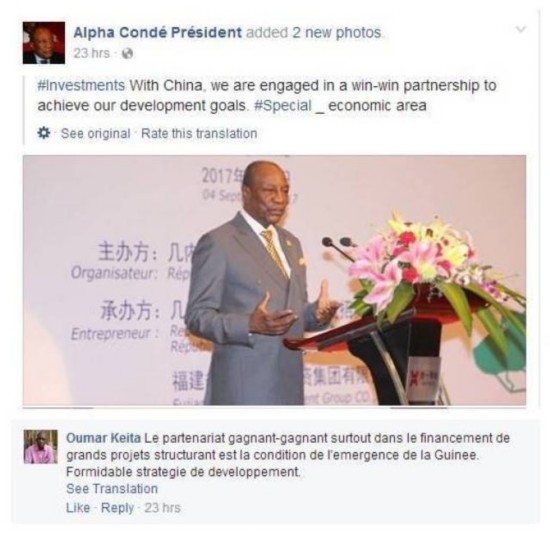 年近八旬的幾內(nèi)亞總統(tǒng)孔戴也在臉譜上記錄下自己的中國(guó)之行。他在一條貼文中寫(xiě)道:“我們與中國(guó)開(kāi)展雙贏合作,以實(shí)現(xiàn)我們的發(fā)展目標(biāo)”。