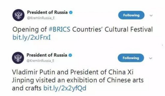 克里姆林宮推特官方賬號(hào)則發(fā)了兩條關(guān)于俄羅斯總統(tǒng)普京出席文化交流活動(dòng)的推文,分別是普京參加金磚國(guó)家文化節(jié)和中國(guó)藝術(shù)品展。人文交流是此次廈門(mén)會(huì)晤上推進(jìn)金磚合作的一大新支柱。