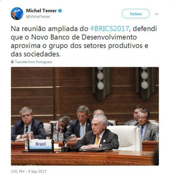在其中一條推文中,特梅爾對(duì)新成立不久的金磚國(guó)家新開(kāi)發(fā)銀行充滿期待。他說(shuō)自己在4日的金磚國(guó)家領(lǐng)導(dǎo)人廈門(mén)會(huì)晤大范圍會(huì)議中呼吁新開(kāi)發(fā)銀行把生產(chǎn)部門(mén)和社會(huì)更緊密地聯(lián)結(jié)在一起。