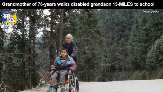 英國(guó)《每日郵報(bào)》1月22日發(fā)表文章,關(guān)注中國(guó)廣西76歲老太史玉英的感人故事。老人每天都會(huì)步行24公里的路,用一把破舊的輪椅推著患腦癱的孫子上學(xué)。報(bào)道稱(chēng),她“4年如一日,風(fēng)雨無(wú)阻,意志堅(jiān)強(qiáng)!