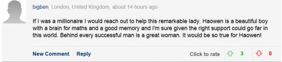 英國(guó)倫敦的網(wǎng)友bigben表示:“如果我能再有錢(qián)一些的話(huà),我一定會(huì)幫助這位偉大的女士的。蔣昊文是個(gè)非常聰明的孩子,擅長(zhǎng)數(shù)學(xué),過(guò)目不忘。他如果能夠有更多的幫助,必定能在世上有所作為。常言說(shuō),‘每個(gè)成功的男人背后都有個(gè)偉大的女人’,昊文背后偉大的女人就是他的奶奶!