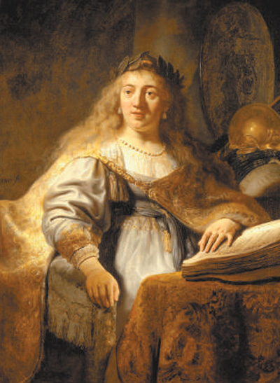 在《穿金邊斗篷的少女》這幅作品中,為了凸顯對明暗光影效果的處理能力,畫中人身著黑色斗篷,連同灰黑的背景,大面積的暗部將作為重點(diǎn)的人物面部烘托出來,宛若聚光式的映照,透過少女面部精致的五官,觀眾仿佛感受到了正款款流出的情思。在倫勃朗筆下,美不再僅僅是對漂亮容顏的寫真,光影之間,鮮活的人物個性塑造才是其孜孜以求的關(guān)鍵,成為最打動人心的地方,畫布里充滿被欣賞的氣氛。而他少有的歷史畫作,也無不彰顯其過人的天資。在《書房中的女神密涅瓦》中,老到而精煉的技法、逼真的物象處理、和諧的光影關(guān)系等,很難讓人相信這幅巨作出自年僅29歲的倫勃朗之手。
