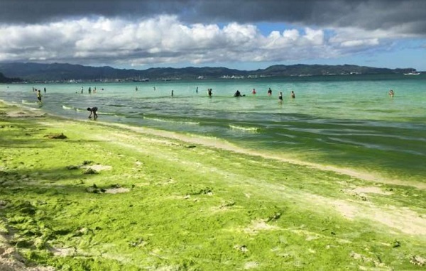 長(zhǎng)灘島的一片白沙灘海藻滋生。(圖片來(lái)自菲律賓媒體,拍攝日期為2017年3月)