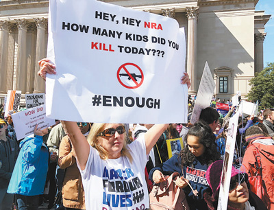3月24日,來自全美各地的近50萬人涌入美國首都華盛頓,參加以“為了我們的生命”為主題的反對槍支暴力大游行。游行者呼吁美國政府采取更加嚴(yán)格的控槍措施,保護校園安全,同時要求政客們不再接受美國全國步槍協(xié)會等團體的政治獻金。這一天,從紐約、波士頓、洛杉磯,再到上月發(fā)生校園槍擊案的佛羅里達(dá)州帕克蘭,同一主題的大游行在全美390多個城市同步舉行。美國民眾尤其是青少年學(xué)生紛紛走上街頭,響亮地發(fā)出他們的聲音:“面對槍支暴力,我們不再沉默,政客們必須在控槍問題上有所作為。”