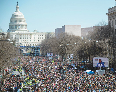 全美大游行是上月14日美國佛羅里達(dá)州帕克蘭市校園槍擊案幸存者發(fā)起的。早在數(shù)天前,組織方就專門建起了網(wǎng)站,在社交媒體廣泛呼吁。24日一大早,連接白宮和國會大廈的賓夕法尼亞大道上擠滿了從各地趕來的學(xué)生。他們高舉標(biāo)語“保護孩子,而不是保護槍支”“從全國步槍協(xié)會拿錢,對我們來說意味著死亡”“不能再有槍支受害者”“國會不需要槍支,需要勇氣”……示威組織方聲稱約有50萬人參加了在華盛頓的集會和游行。據(jù)華盛頓地鐵運營商的統(tǒng)計,當(dāng)天有約33萬人乘坐了地鐵。與此前的反槍支暴力游行不同的是,24日的示威人群多數(shù)是中小學(xué)生。