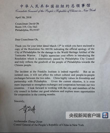 目前,這份書面道歉決議已經(jīng)正式呈交中國(guó)駐紐約總領(lǐng)事章啟月,得到了中方的書面回復(fù),并于當(dāng)?shù)貢r(shí)間4月5日轉(zhuǎn)呈陜西省文物交流中心。(央視記者 王萌 王風(fēng)華)