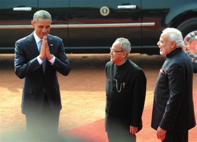 泰姬陵不僅清潔一新,印度政府還派重兵守衛(wèi)。白宮卻宣布奧巴馬不參觀泰姬陵了。25日,印度首都新德里,奧巴馬任期內(nèi)第二次訪問印度,印度總理莫迪(右)前往迎接……