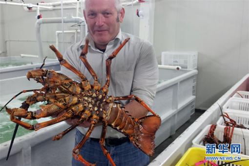 這張未注明拍攝時間的照片顯示,新西蘭峽灣龍蝦有限公司北島負責人艾倫·科斯格羅夫在奧克蘭出口工廠展示一只野生巖龍蝦。 新西蘭最大龍蝦出口商——峽灣龍蝦有……