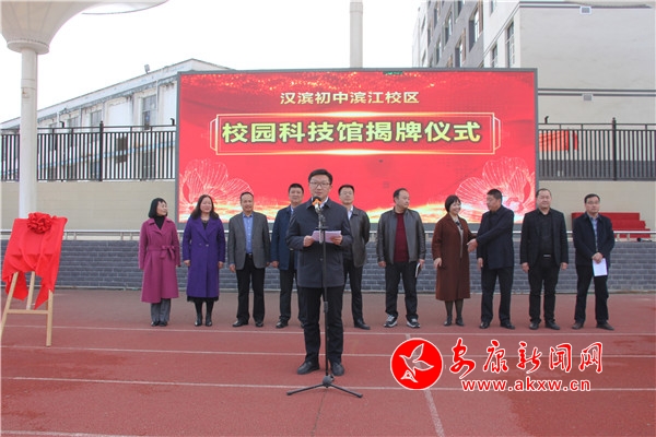 馬曉寧校長首先向與會人員介紹了校園科技館及校區(qū)開展科技教育的基本情況。隨后,區(qū)科協(xié)主席李森乾、漢濱初中校長徐平共同為濱江校區(qū)科技館揭牌,李主席還代表區(qū)科協(xié)向濱江校區(qū)捐贈了科技創(chuàng)新大賽優(yōu)秀作品書籍。