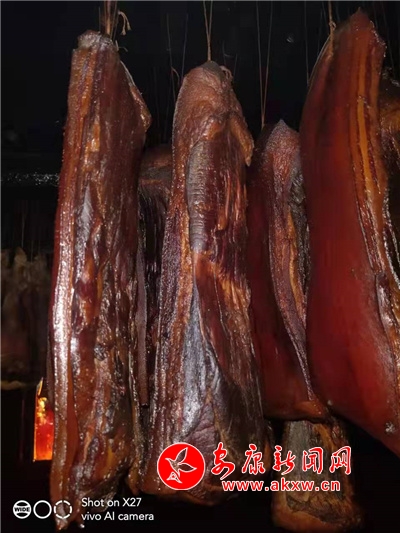 曹祖康的臘肉熏房是經(jīng)過特殊設(shè)計修建的,非常環(huán)保,熏制臘肉用的是青岡木和鋸末,這樣熏出來的臘肉香味濃,夏季沒有蚊蟲叮咬,即使三伏天也不會變質(zhì)。經(jīng)過熏制后,取下燒皮,用熱水洗干凈,掛在庫房里晾干,經(jīng)過這些工序,臘肉就做成了。