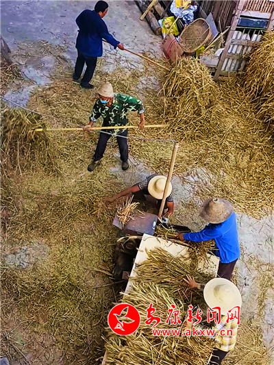 6月6日,驕陽(yáng)似火。漢濱區(qū)赤衛(wèi)村周全洪一家忙得不亦樂(lè)乎,他戴著草帽和口罩,將麥穗一把一把喂進(jìn)脫粒機(jī),幫忙的鄰居們或抱捆持簸或木叉飛揚(yáng),妻子不停地晃動(dòng)手中竹篩,金燦燦的麥粒散落成堆,女兒夢(mèng)蝶一邊端茶水遞毛巾,一邊用手機(jī)直播:“這是陜南農(nóng)村傳統(tǒng)的打麥子方式。”“形象很酷,動(dòng)作很帥……是不是?”“要吃富硒新麥子,可以呀!”益農(nóng)的“新農(nóng)具”,帶貨又漲粉。