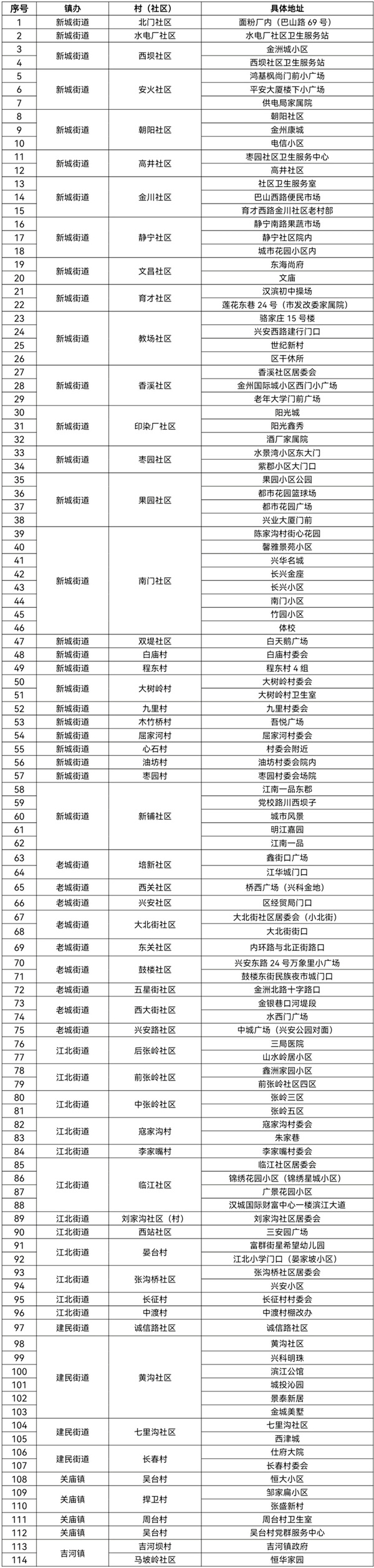 共設(shè)置114個采樣點(見附件),由各街道、鎮(zhèn)政府統(tǒng)一安排采樣點設(shè)置、人員組織、秩序維護。檢測對象按照街道和鎮(zhèn)政府要求,分時段有序到指定地點進(jìn)行采樣,避免人員聚集。