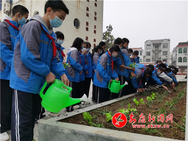 “請(qǐng)幫我拿幾株菜苗!”八年級(jí)一班的學(xué)生們?cè)谄秸玫目盏乩餇?zhēng)先恐后地移植著生菜,身后三兩個(gè)手拿灑水壺的學(xué)生正在為栽好的菜苗澆水。在老師的指導(dǎo)下,學(xué)生們積極參與平整土地、起苗、打坑、栽植、澆水,不一會(huì)兒,又一塊橫成行、縱成列的生菜地,出現(xiàn)在該校園一角。