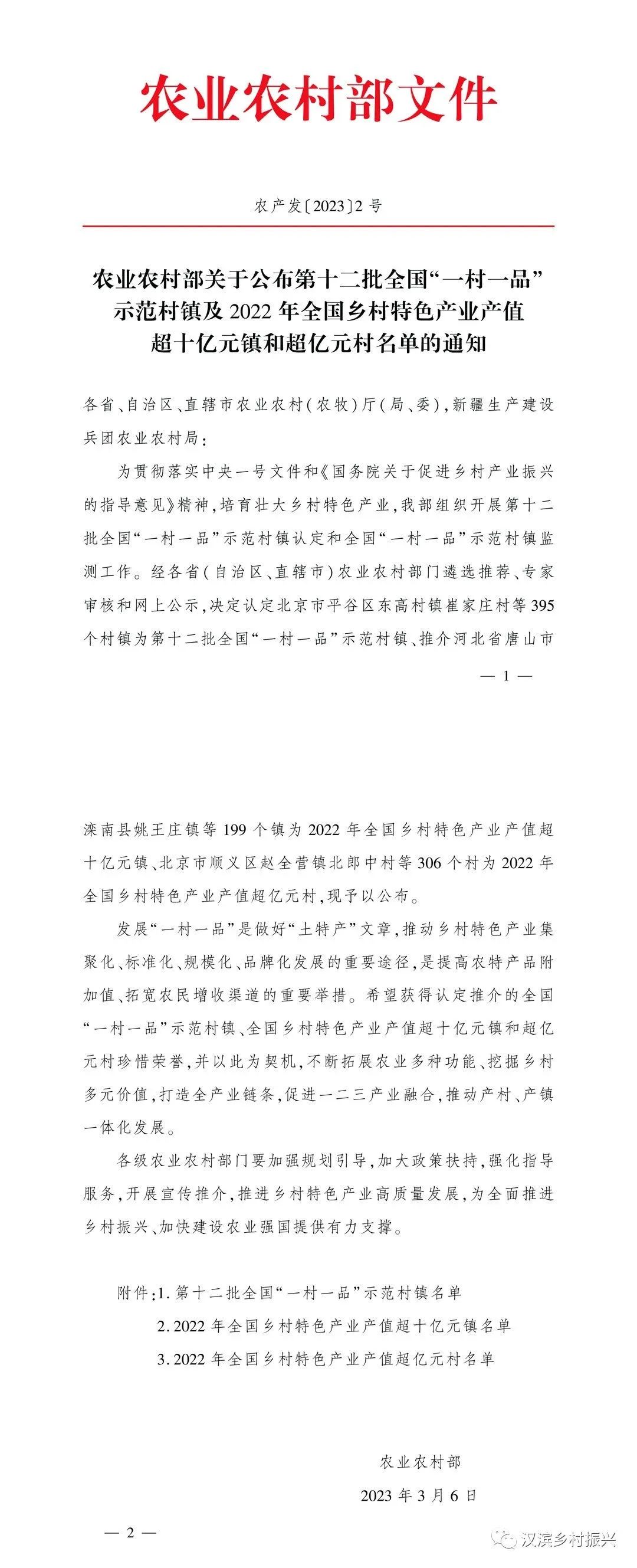 近日,農(nóng)業(yè)農(nóng)村部發(fā)布《關(guān)于公布第十二批全國(guó)“一村一品”示范村鎮(zhèn)及2022年全國(guó)鄉(xiāng)村特色產(chǎn)業(yè)產(chǎn)值超過(guò)十億元鎮(zhèn)和超億元村名單的通知》,漢濱區(qū)晏壩鎮(zhèn)入選第十二批全國(guó)“一村一品”示范村鎮(zhèn)名單。