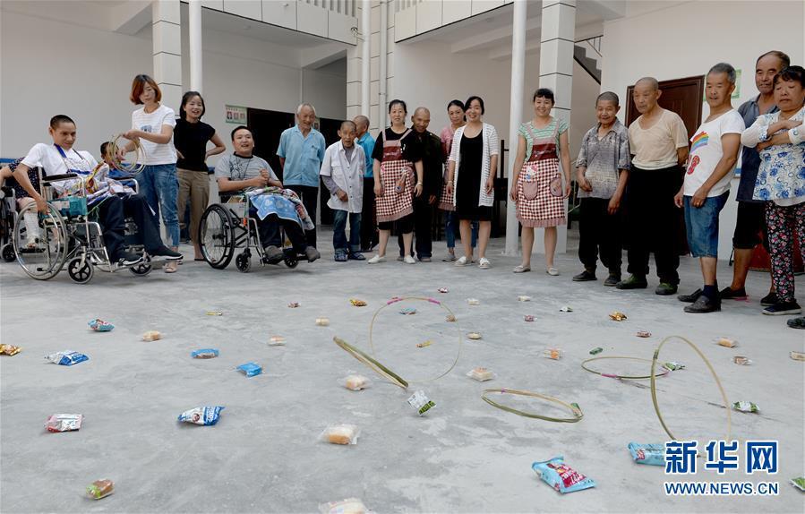 寧陜縣中心敬老院五保失能托養(yǎng)中心內(nèi),托養(yǎng)人員在一起進(jìn)行套圈游戲(8月20日)。 自2016年9月起,陜西寧陜縣開始實(shí)行貧困失能、半失能人員集中供養(yǎng),為其提供干凈舒適的住所、24小時(shí)全面護(hù)理,不僅讓貧困失能、半失能人員得到良好照料,也徹底將失能家庭解放出來,全身心脫貧致富奔小康。目前,寧陜登記在冊(cè)貧困失能、半失能人員共有467人,其中320人已分別在全縣4個(gè)敬老院的五保失能托養(yǎng)中心內(nèi)進(jìn)行集中供養(yǎng),剩余人員將于托養(yǎng)中心床位逐步完善后全部入住。 新華社記者 劉瀟 攝