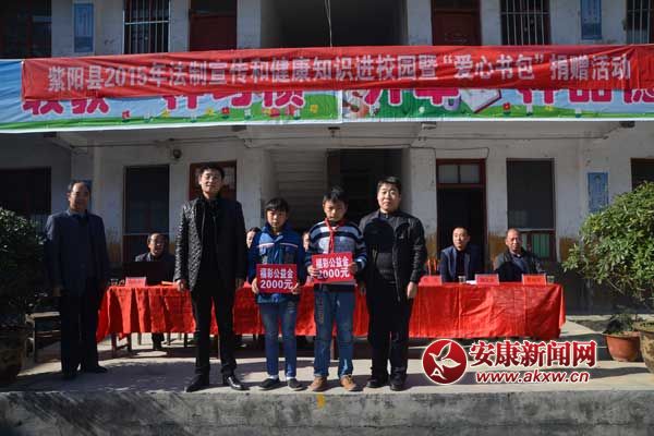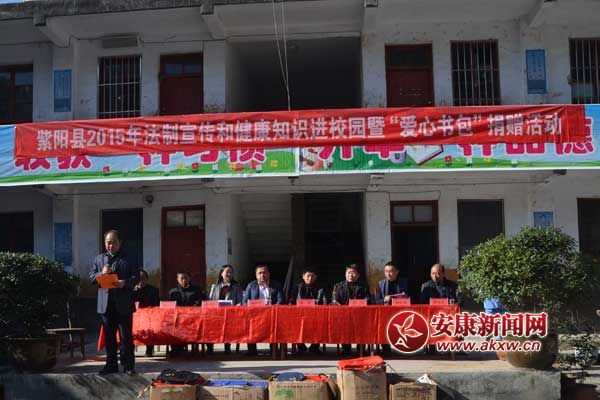 安康新聞網(wǎng)訊 (通訊員 肖寶) 在“12•4”國(guó)家憲法日暨全國(guó)法制宣傳日即將到來(lái)之際,11月26日,由紫陽(yáng)團(tuán)縣委舉辦的紫陽(yáng)縣2015年法制宣傳和健康知識(shí)進(jìn)校園暨“愛(ài)心書(shū)包”捐贈(zèng)活動(dòng)走進(jìn)斑桃小河小學(xué);顒(dòng)現(xiàn)場(chǎng),紫陽(yáng)團(tuán)縣委為全校學(xué)生購(gòu)買了價(jià)值1.5萬(wàn)元的愛(ài)心書(shū)包和手套,并及時(shí)發(fā)放到了每個(gè)學(xué)生的手中。