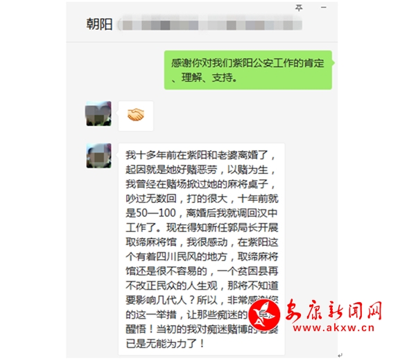 8月7日8時(shí)25分,紫陽縣公安局新媒體中心接到電話號(hào)碼為1589166****的漢中籍男士打來的電話,在電話里,該男士非常激動(dòng)的對(duì)紫陽縣公安局作出的開展貧困村麻將館、棋牌室集中整治專項(xiàng)行動(dòng)贊不絕口,該男士在電話里訴說:“我是漢中人,有正式工作,也是紫陽女婿,多年前和媳婦一起住在紫陽,紫陽是個(gè)好地方,但是,就是賭博之風(fēng)太嚴(yán)重了,媳婦一度沉迷賭博,屢次勸說不聽,一場牌局下來,少則輸幾千,多則輸幾萬,幾年下來,殷實(shí)的家庭四處舉債,一度舉步維艱,迫不得已,和媳婦離了婚,傷心之余,將工作調(diào)回了漢中。前幾天,在網(wǎng)上看到了紫陽縣公安局發(fā)出的禁賭通告,覺得非常好,要脫貧,就要先禁賭,特別感謝郭書記!這次禁賭行動(dòng),是給那些喜好賭博的人敲響了警鐘,告誡那些沉迷賭博的人:應(yīng)該把精力放在脫貧致富、建設(shè)美好家園上,沉迷賭博,害人害已。”