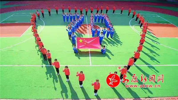 幾十名身穿藍(lán)色班服的學(xué)生在操場(chǎng)正中央排成數(shù)字“70",在數(shù)字正前面,四名同學(xué)展開(kāi)國(guó)旗,然后,數(shù)十名身穿紅色班服的學(xué)生在外圍圍成"心"形。"70",象征著70周年,"心"型, 寓含著孩子們對(duì)偉大祖國(guó)的熱愛(ài)。整個(gè)造型寓意深刻,活動(dòng)表現(xiàn)形式新穎獨(dú)特,令人耳目一新。