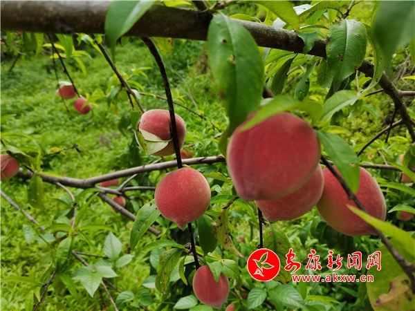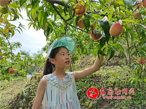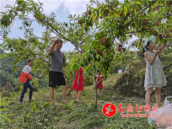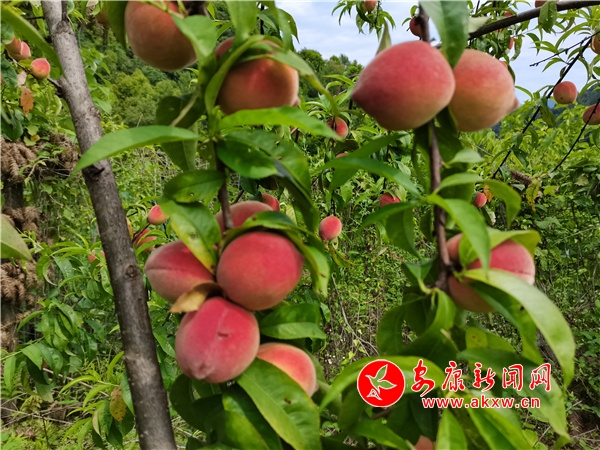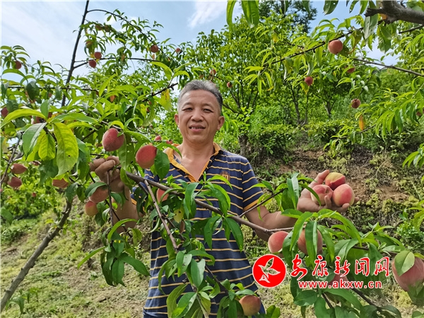 “當下正是蜜桃的最佳采摘期,我們這里生態(tài)好,植被覆蓋率高、水資源豐富,氣候適宜,在這樣自然條件下生長出來的果子是純天然、無污染、原生態(tài)的。你看,這些果子顆顆飽滿,個頭均勻,肉厚核小,口感香甜多汁,且采摘持續(xù)時間長,可以采摘到七月下旬”。為了讓大家吃到品質(zhì)好的桃,我和妻子參加了鎮(zhèn)農(nóng)綜站牽頭的種植、養(yǎng)殖培訓,在他們的指導下熟練的掌握了種養(yǎng)技術(shù)。通過控制掛果密度讓每個果子充分享受陽光和養(yǎng)分,這樣才能結(jié)出又甜又好的果子。”種植大戶胡小飛介紹說。