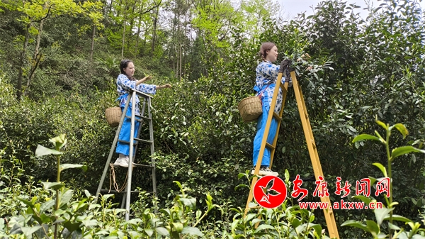 4月28日,安康市紫陽(yáng)縣雙橋鎮(zhèn)蓮花村村民正搭著梯子,采摘古茶樹鮮葉。通訊員 儲(chǔ)茂銀攝