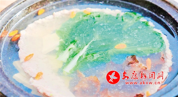 “白火石汆湯是我跟我祖父和父親學的手藝,13歲開始學做廚,白火石汆湯里面主要用到新鮮的豬肉,加蔥姜、蛋清、鹽、雞精以及料酒、生粉、蛋清,將其剁成肉泥,貼到陶盆里面,上厚下薄,里面陸續(xù)放上木耳、小青菜、豆腐,然后把石頭燒紅之后放進陶盆內(nèi)的紗布中,只消幾分鐘,一道美味可口的白火石汆湯便做好了。”解遠平一邊準備食材,一邊向筆者介紹著白火石汆湯的做法。