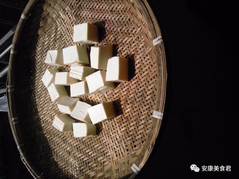 豆腐切塊,要切厚,上鍋干蒸,3至5分鐘,蒸的時(shí)間越長,豆腐里的水分越少,做出來的豆腐乳越硬,然后取出來晾著。