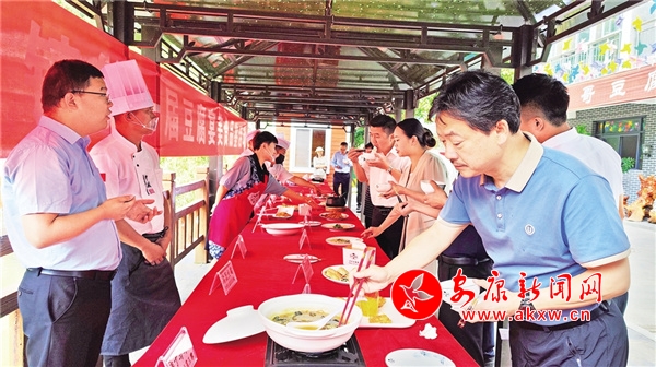活動(dòng)現(xiàn)場,壹品坊豆腐、王莽山莊、鄭家農(nóng)家樂、胡桃里農(nóng)莊、舒大嫂農(nóng)家樂、方氏豆腐坊、財(cái)哥豆腐宴等10家農(nóng)家樂帶來的37個(gè)美味的菜品一一呈上長條桌,供現(xiàn)場參與人員品鑒。