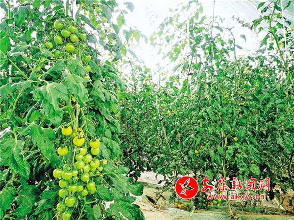 大片綠油油的菜園里,竹條支起的架子上爬滿了藤蔓,隱約可見藤蔓下藏著點點鮮紅,春日的艷陽里,點點紅色在綠葉的掩映下,顯得格外動人,大石嶺的圣女果紅了。