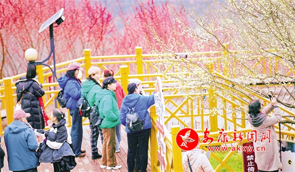 石泉縣濱江大道上紅梅競相綻放,廣大游客駐足觀看,打卡留念。譚文昌 攝