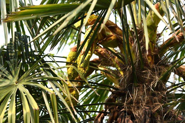 到了80年代初,當(dāng)?shù)貢r興起棕床,睡起來柔軟又有彈性,舒適又隔潮氣,家道殷實人家相繼都拆掉了稻谷草鋪就的架子床換成美觀新潮的棕床,后來我才知道,做一張床,除了木料和繩子,還得十幾塊工匠錢,記得父親在陡坡上搬樹摔了一跤腰部受損,天氣一變就不停地呻吟,姐姐便使喚我們割遍自留山的棕,勉強(qiáng)織了一張床,是夜,父親睡得很安穩(wěn)。棕樹開的花也很有特點,花形呈佛手狀,花籽如粟米子樣金黃亮色,味道有點淡淡的苦,婆在世時常說棕樹花燉豬心,娃娃吃了補心肺,長記性,我上學(xué)時再生僻的詩文,看過一遍就爛熟于心,或許與吃過此湯不無關(guān)系,我在想,棕花入藥對治愈新冠肺炎應(yīng)該療效不錯,它也是一副神奇的中藥方劑。
